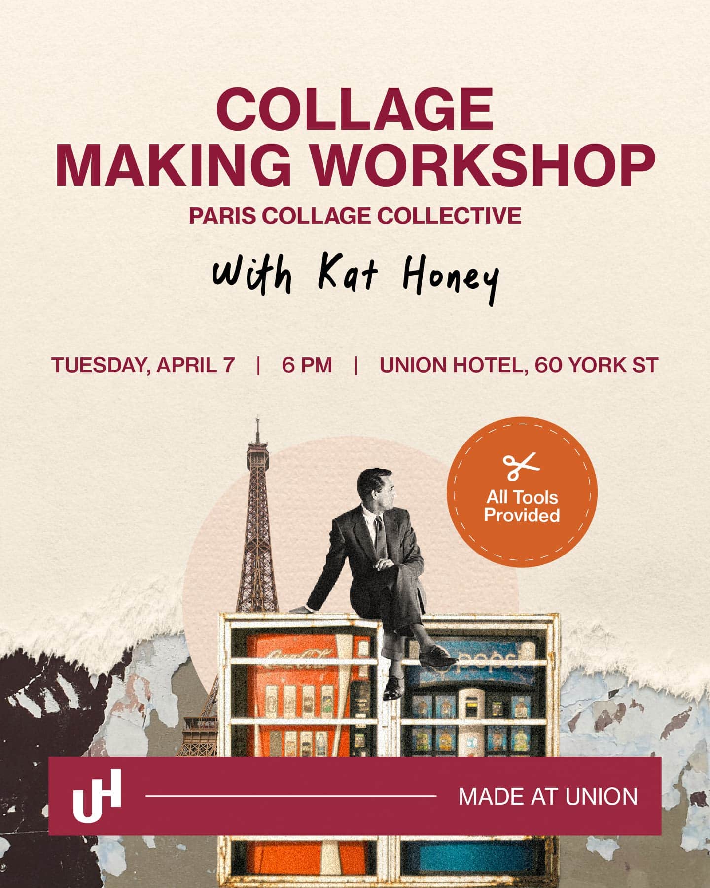 Create a meaningful mixed-media collage with artist Kat Honey at Union Hotel’s ‘Made at Union’ series. Unleash your inner creative!